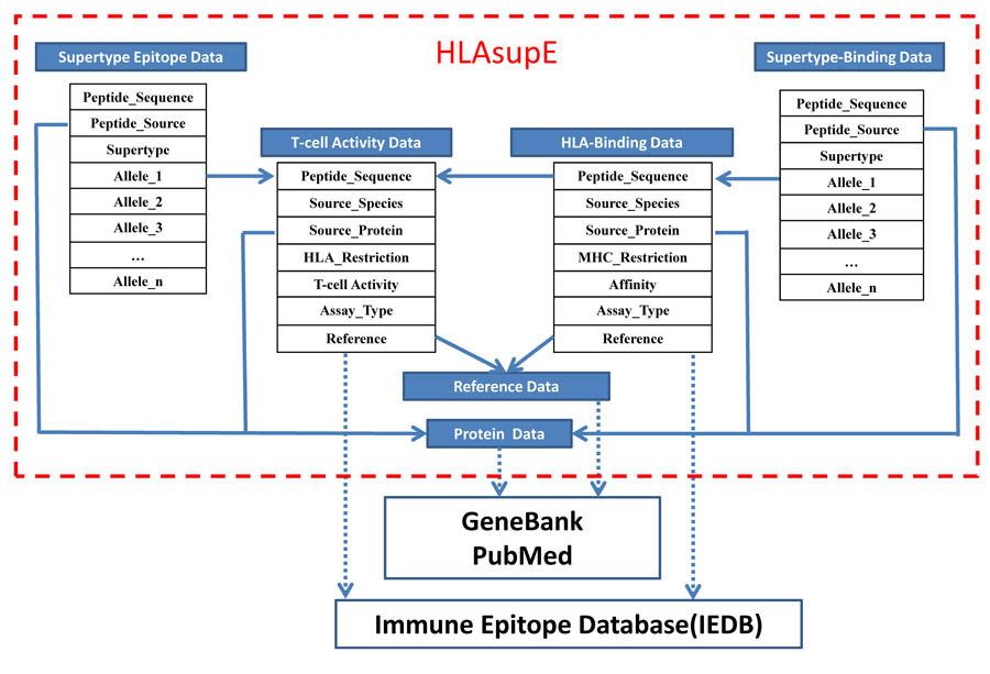 The query tools provided in the home page of HLAsupE aim to search for supertype-specific epitopes (T-cell activities), whereas the query tools for supertype-specific binding peptides (MHC-binding data) are provided in HLAsupB.